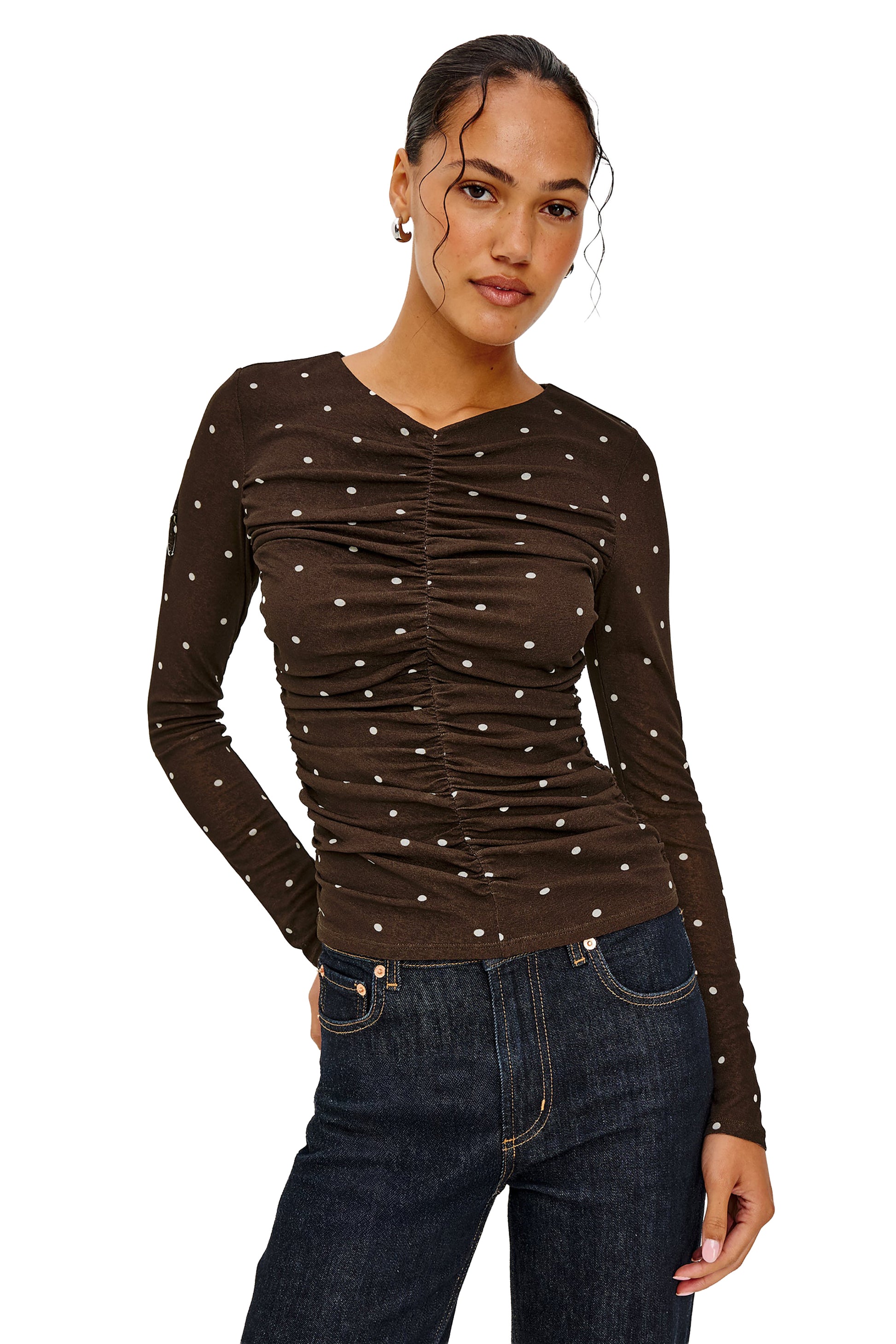 - Gathered shirring detail at the front