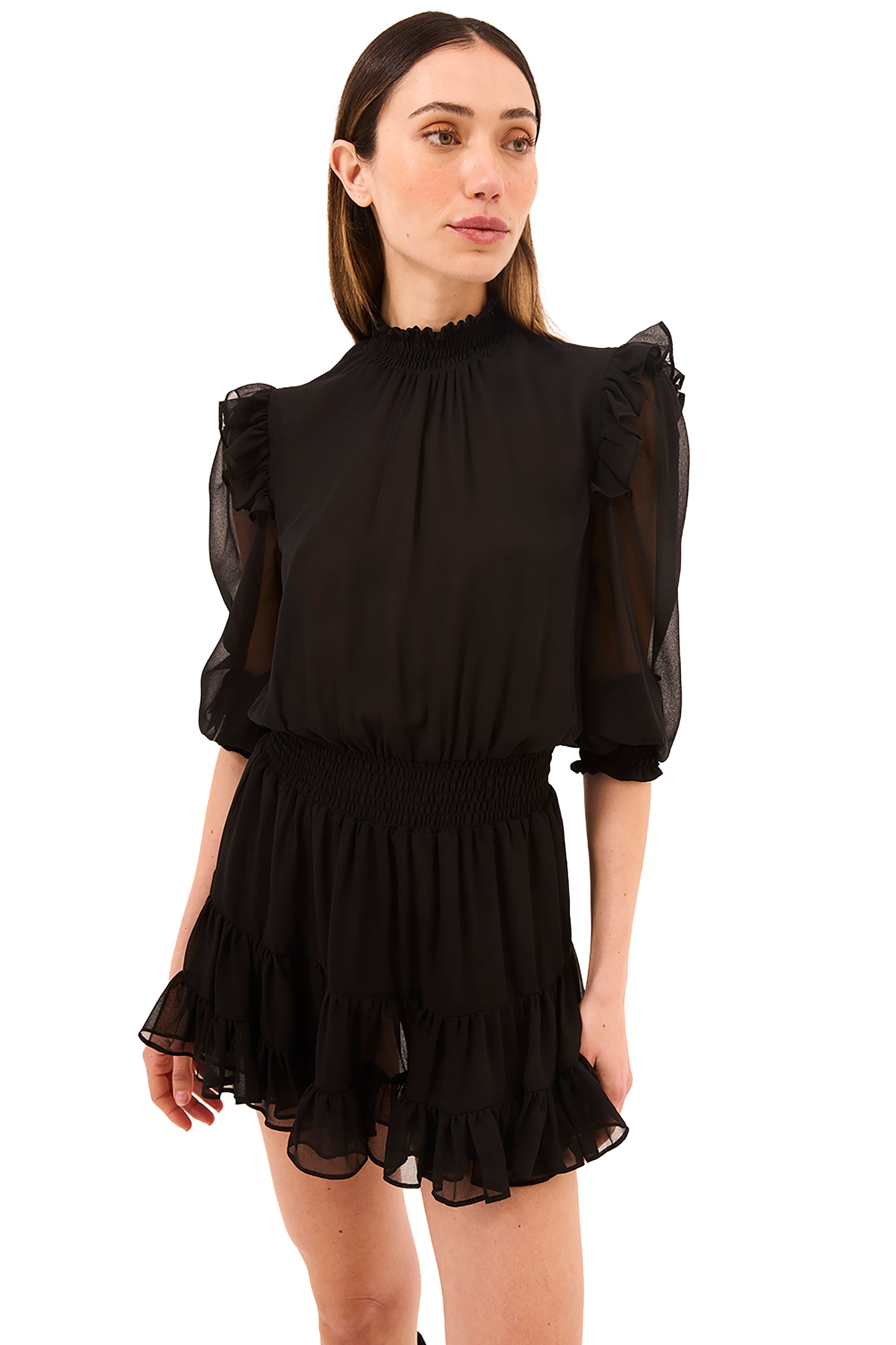 - Slightly puffed shoulders with delicate ruffle trim
