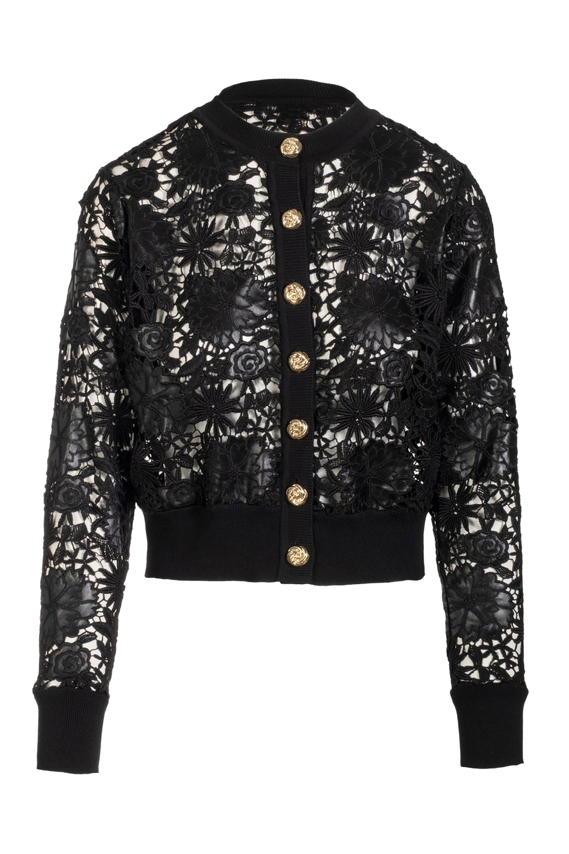 - Black lace layered with bold vegan leather appliqué
